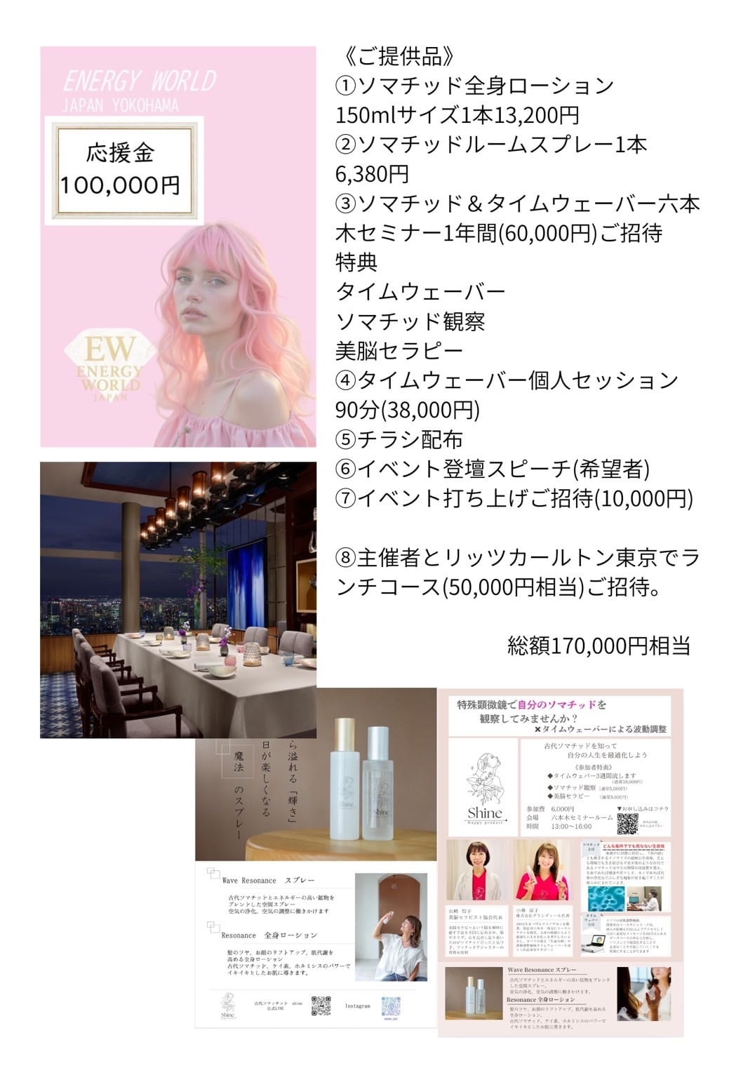 【古代ソマチッドルームスプレー➕全身ローション➕shine六本木セミナー1年間ご招待➕チラシ配布➕登壇スピーチ(希望者)➕イベント打ち上げご招待➕主催者(小林、山﨑)とリッツ・カールトン東京でランチご招待】を提供します。 総額170,000円相当